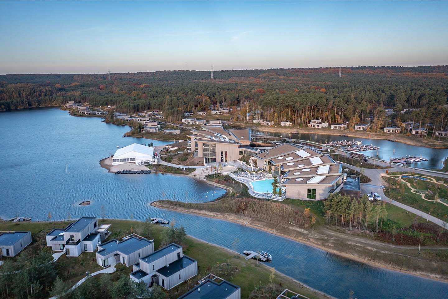 The new Terhills Resort holiday village in Dilsen-Stokkem offers guests a stay in the heart of nature. Spread over 356 hectares in the province of Limburg, the resort borders the Haute Campine National Park and provides an entrance to this unique park in Belgium