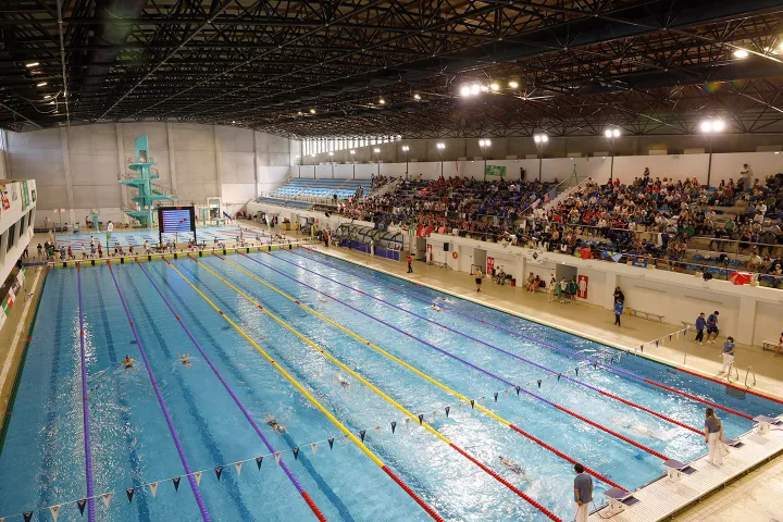 Jamor Swimming Pool Complex, which opened in July 1998, was the first indoor installation in Portugal capable of hosting national and international competitions for all aquatic disciplines. The complex incorporates an Olympic-sized swimming pool (50mx25mx2.1m), a 25mx20m swimming pool with an adjustable floor up to 5m and a diving tower (10m, 7.5m, 5m, 3m and 1m) and trampolines (3m and 1m high). It can seat up to 1,200 spectators.