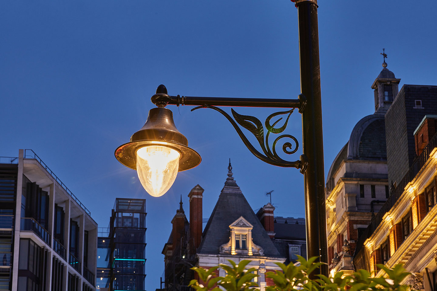 Beyond performance, the scheme celebrates craftsmanship. Cadogan’s vision was inspired by the nearby Holy Trinity Church and its Arts and Crafts heritage. In collaboration with LAPD, John McAslan + Partners, and Bethan Griffiths of Topp & Co., a metalwork artist specialising in blacksmith-made ironwork, the final column design was produced. Bespoke cast embellishments were created, including top finials, pedestrian brackets, mid-column details, and base accents, giving each column a distinctive finish that is firmly rooted in its surroundings.